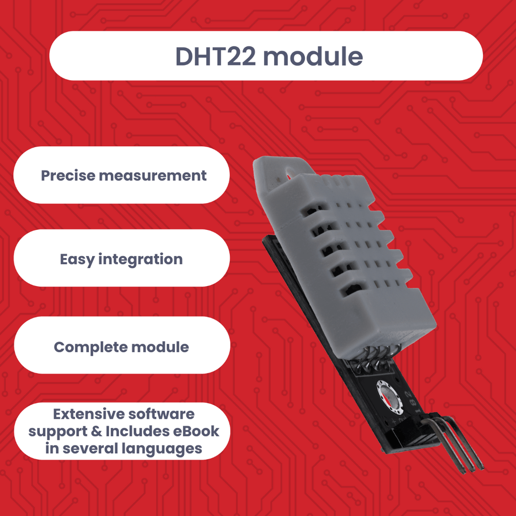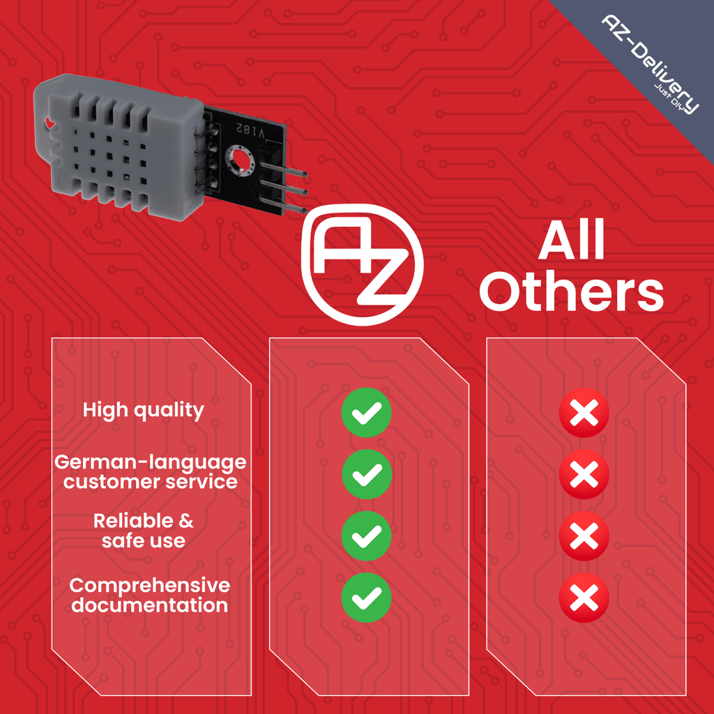 Der AZDelivery DHT22 ist ein digitaler Temperatur- und Luftfeuchtigkeitssensor, der sich durch seine hohe Genauigkeit und einfache Handhabung auszeichnet. Er misst Temperaturen von -40 °C bis +125 °C mit einer Abweichung von nur ±0.5 °C sowie Luftfeuchtigkeit von 0 % bis 100 % mit ±2–5 % Genauigkeit. Damit eignet er sich hervorragend für Anwendungen in der Raumklimaüberwachung, Smart Home, Wetterstationen oder Landwirtschaft.