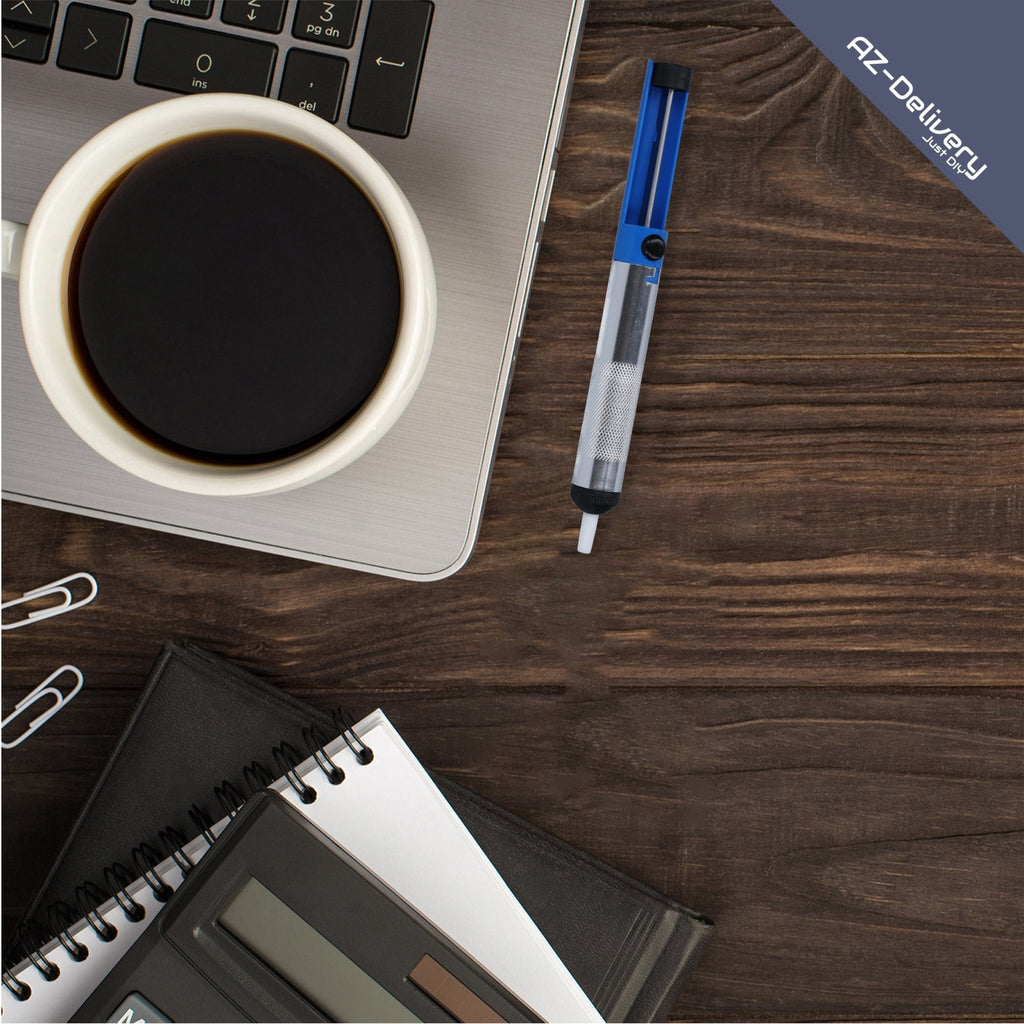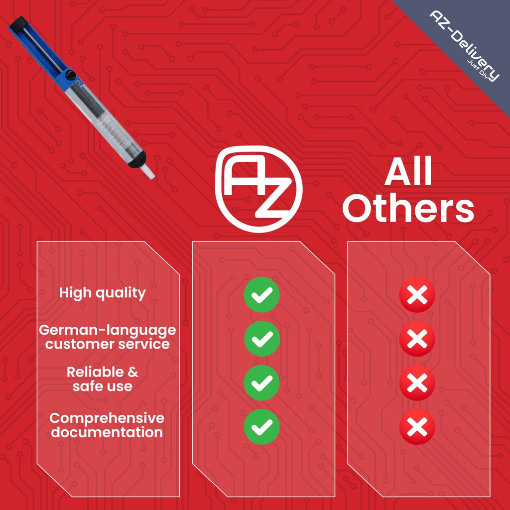 ✅ Bomba desoldadora eficaz con gran potencia de succión - La AZDelivery La bomba de soldadura elimina de forma fiable soldadura, soldadura vieja, fundente y residuos de soldadura de placas de circuito, componentes y conexiones. Perfecto para reparaciones, electrónica y proyectos de bricolaje.