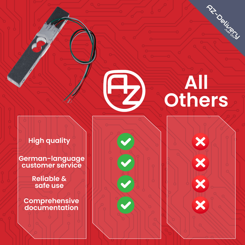 Gracias a las detalladas instrucciones de inicio rápido y al libro electrónico gratuito, la configuración es rápida y sencilla. El código de ejemplo incluido permite empezar de inmediato en C++ (Arduino) o Python (Raspberry Pi). Confía en AZ-Delivery – Tu marca de microelectrónica y accesorios de alta calidad con documentación en alemán y asistencia técnica de primera clase.