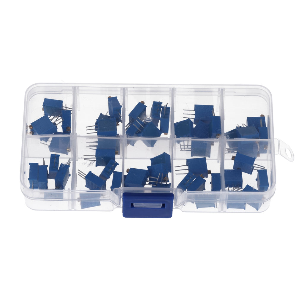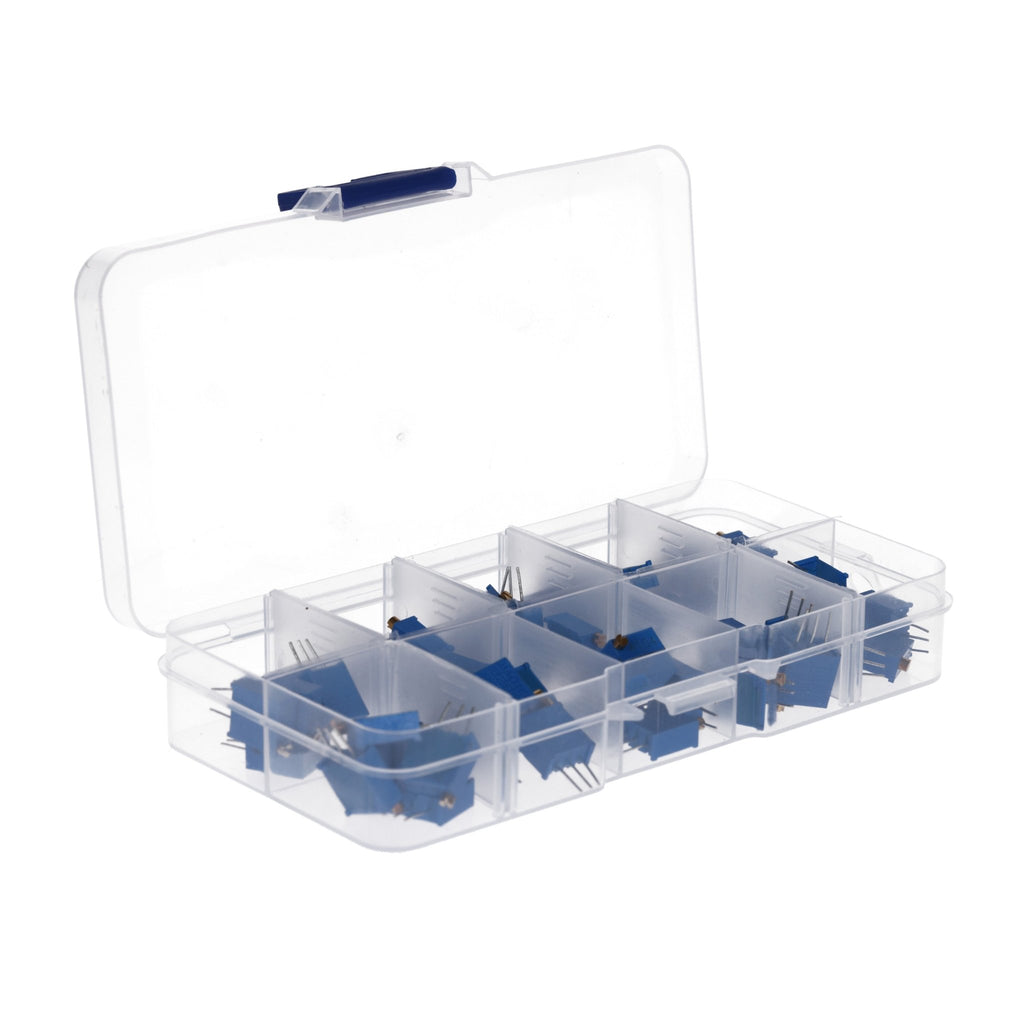 💼 Praktisches Sortiment – Enthält 60 Stück (je 5 pro Wert) der 3296W Trimmer Potentiometer, ordentlich sortiert in einer robusten Aufbewahrungsbox für einfachen Zugriff und sichere Lagerung.