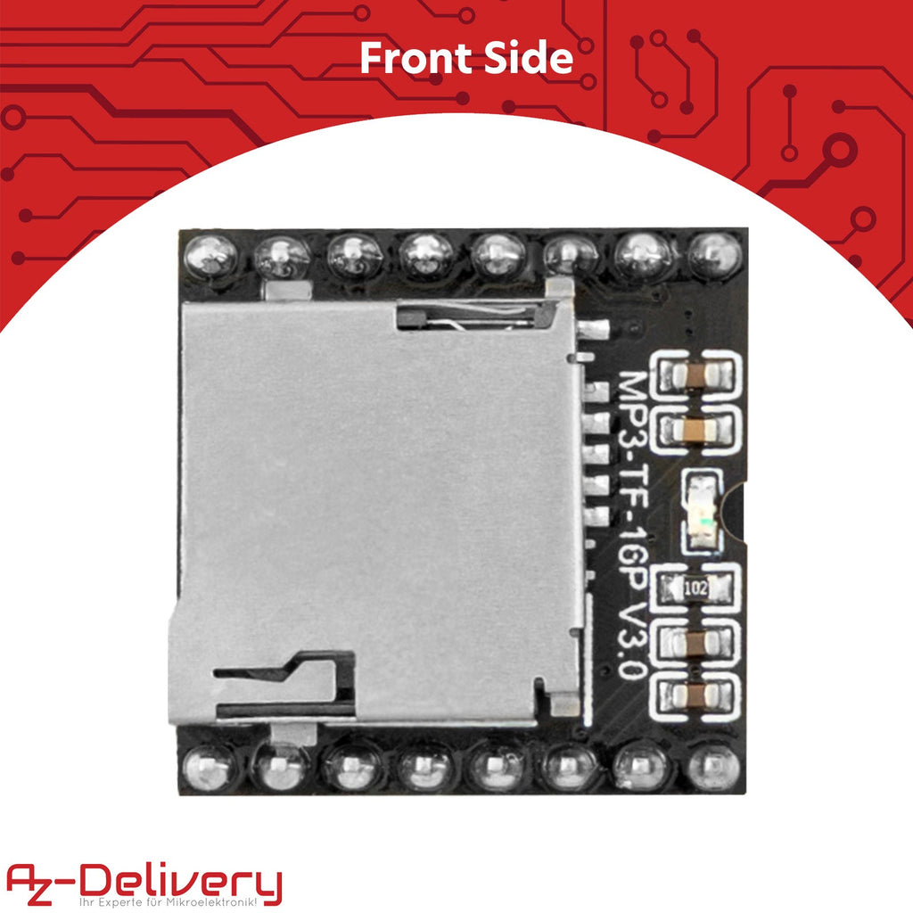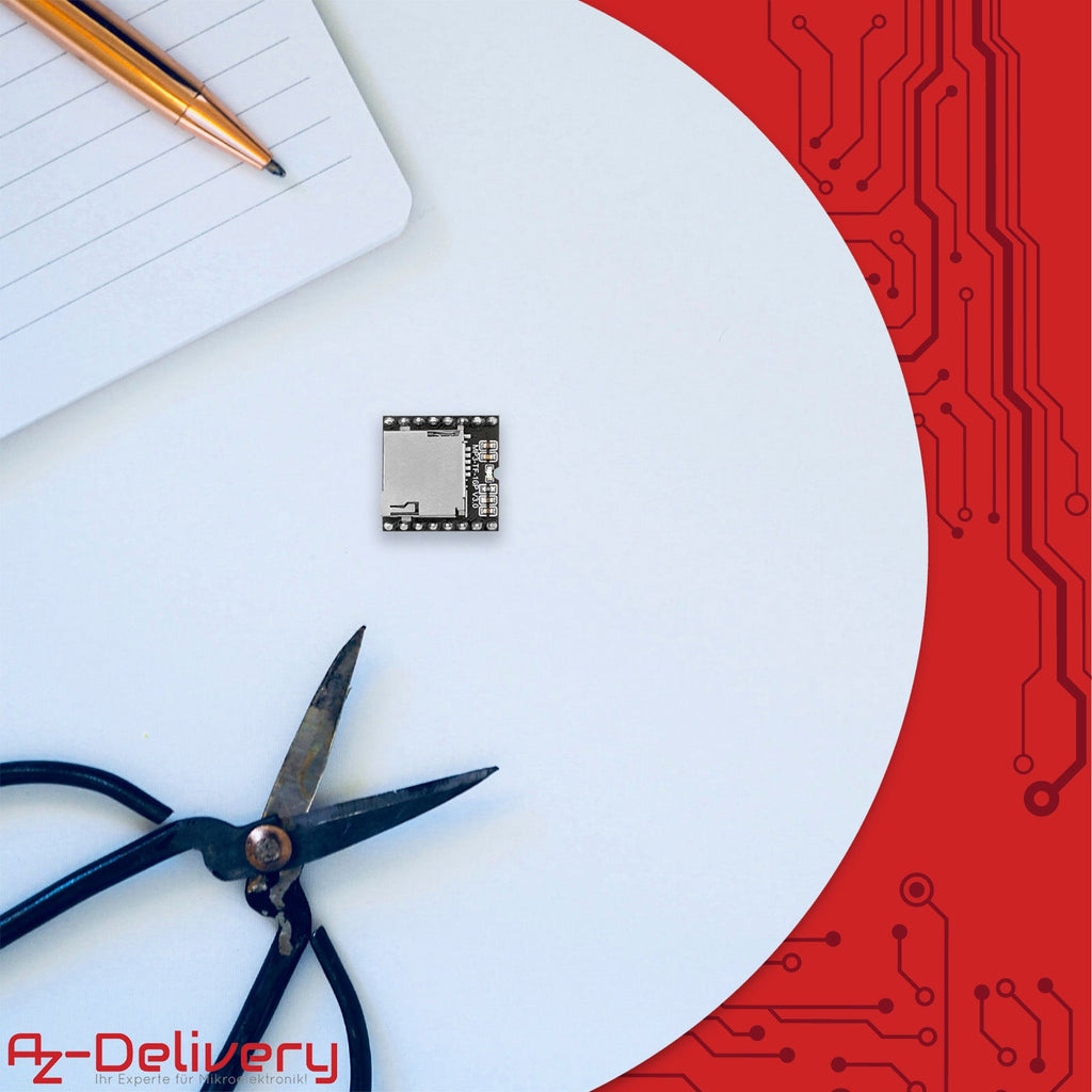 Questo modulo contiene solitamente uno slot per schede micro SD, un'interfaccia seriale e un jack per cuffie o un'altra uscita audio. Dispone inoltre di diversi pin di controllo come play, next, previous e pin di controllo del volume, che possono essere controllati tramite il microcontrollore. Il modulo può riprodurre file audio MP3 e WAV e supporta schede SD e unità flash USB come memoria esterna.