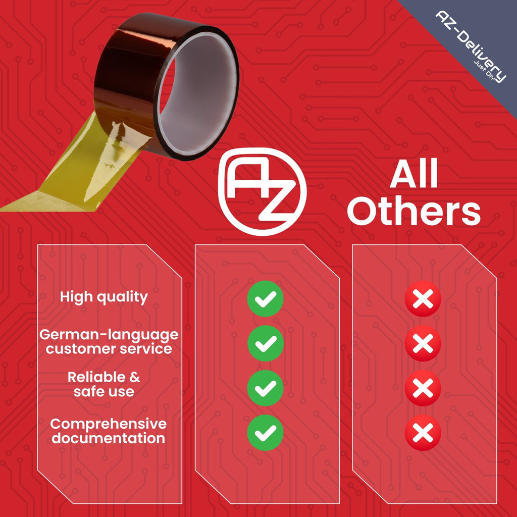 La larghezza di 5 cm di larghezza e 33 m di nastro adesivo in poliimmide di lunghezza offre un'eccellente resistenza al calore fino a 300 ° C ed è perfetta per applicazioni tecniche come stampa 3D, pressione di sublimazione, isolamento elettronico e riparazioni. Grazie all'adesivo in silicone che può essere rimosso gratuitamente, è ideale per superfici sensibili. Il nastro adesivo è costituito da un film di poliimmide duratura, che è costantemente contro sostanze chimiche, raggi UV e abrasione. Sia per processi ad alta temperatura o riparazioni quotidiane, questo nastro adesivo resistente al calore soddisfa le più alte esigenze.